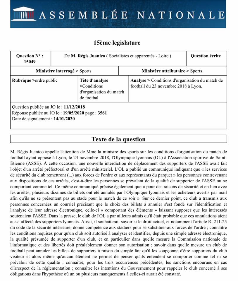 Après une attente de… 18 mois -alors que le délai de réponse est fixée à deux mois-, après un premier signalement pour défaut de réponse au début de l’année 2020, le gouvernement, la veille de l’examen du rapport parlementaire sur le supportérisme à l’Assemblée Nationale, vient enfin de répondre et donne raison aux supporters Stéphanois qui s’était plaint des modalités d’organisation du derby OL-ASSE le 23 novembre 2018.