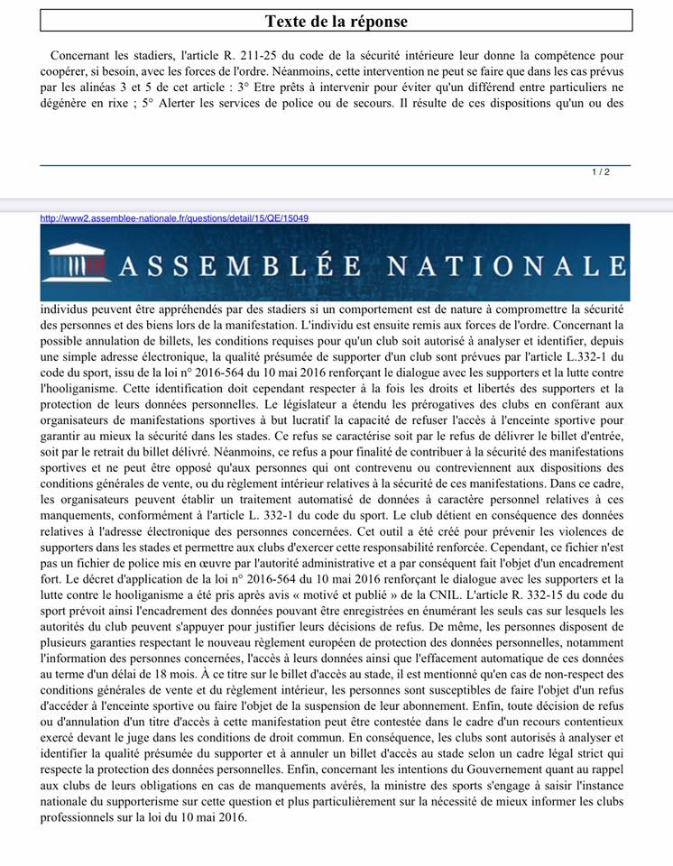 Le Gouvernement entend d’ailleurs rappeler aux clubs leurs obligations en cas de manquements avérés et s’engage à saisir l’instance nationale du supporterisme de cette question et plus particulièrement sur la nécessité de mieux informer les clubs professionnels sur la loi du 10 mai 2016.