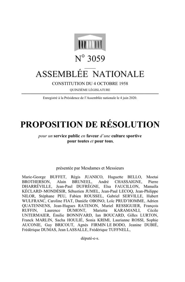 Avec Marie-George Buffet, ancienne ministre des sports et quarante collègues député(e)s, nous venons de déposer à l’Assemblée Nationale cette proposition de résolution pour un service public en faveur d’une culture sportive pour toutes et tous.