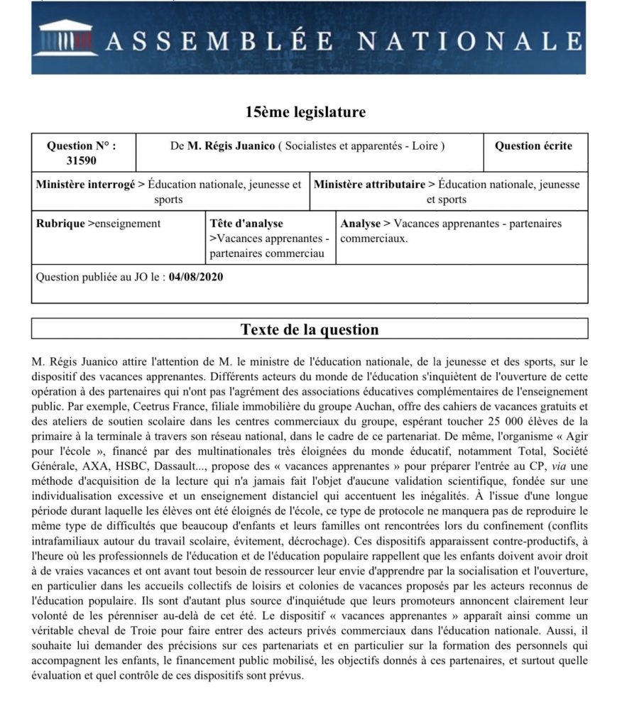 M. Régis Juanico attire l’attention de M. le ministre de l’éducation nationale, de la jeunesse et des sports sur le dispositif des vacances apprenantes. Différents acteurs du monde de l’éducation s’inquiètent de l’ouverture de cette opération à des partenaires qui n’ont pas l’agrément des associations éducatives complémentaires de l’enseignement public. Par exemple, Ceetrus France, filiale immobilière du groupe Auchan, offre des cahiers de vacances gratuits et des ateliers de soutien scolaires dans les centres commerciaux du groupe, espérant toucher 25 000 élèves de la primaire à la terminale à travers son réseau national, dans le cadre de ce partenariat. De même, l’organisme « Agir pour l’école », financé par des multinationales très éloignées du monde éducatif, notamment Total, Société Générale, AXA, HSBC, Dassault…, propose des « vacances apprenantes » pour préparer l’entrée au CP, via une méthode d’acquisition de la lecture qui n’a jamais fait l’objet d’aucune validation scientifique, fondée sur une individualisation excessive et un enseignement distanciel qui accentuent les inégalités. A l’issue d’une longue période durant laquelle les élèves ont été éloignés de l’école, ce type de protocole ne manquera pas de reproduire le même type de difficultés que beaucoup d’enfants et leurs familles ont rencontré lors du confinement (conflits intrafamiliaux autour du travail scolaire, évitement, décrochage…). Ces dispositifs apparaissent contreproductifs, à l’heure où les professionnels de l’éducation et de l’éducation populaire rappellent que les enfants doivent avoir droit à de vraies vacances et ont avant tout besoin de ressourcer leur envie d’apprendre par la socialisation et l’ouverture, en particulier dans les accueils collectifs de loisirs et colonies de vacances proposés par les acteurs reconnus de l’Éducation Populaire. Ils sont d’autant plus source d’inquiétude que leurs promoteurs annoncent clairement leur volonté de les pérenniser au-delà de cet été. Le dispositif « vacances apprenantes » apparaît ainsi comme un véritable cheval de Troie pour faire entrer des acteurs privés commerciaux dans l’éducation nationale. Aussi, il souhaite lui demander des précisions sur ces partenariats et en particulier sur la formation des personnels qui accompagnent les enfants, le financement public mobilisé, les objectifs donnés à ces partenaires, et surtout quelle évaluation et quel contrôle de ces dispositifs sont prévus.