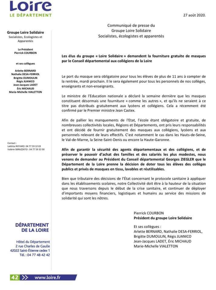 Afin de garantir la sécurité des agents départementaux et des collégiens, et de préserver le pouvoir d’achat des familles et des salariés les plus modestes, nous venons de demander au Président du Conseil départemental Georges ZIEGLER que le Département de la Loire prenne la décision de doter tous les élèves des collèges publics et privés de masques en tissu, lavables et réutilisables.