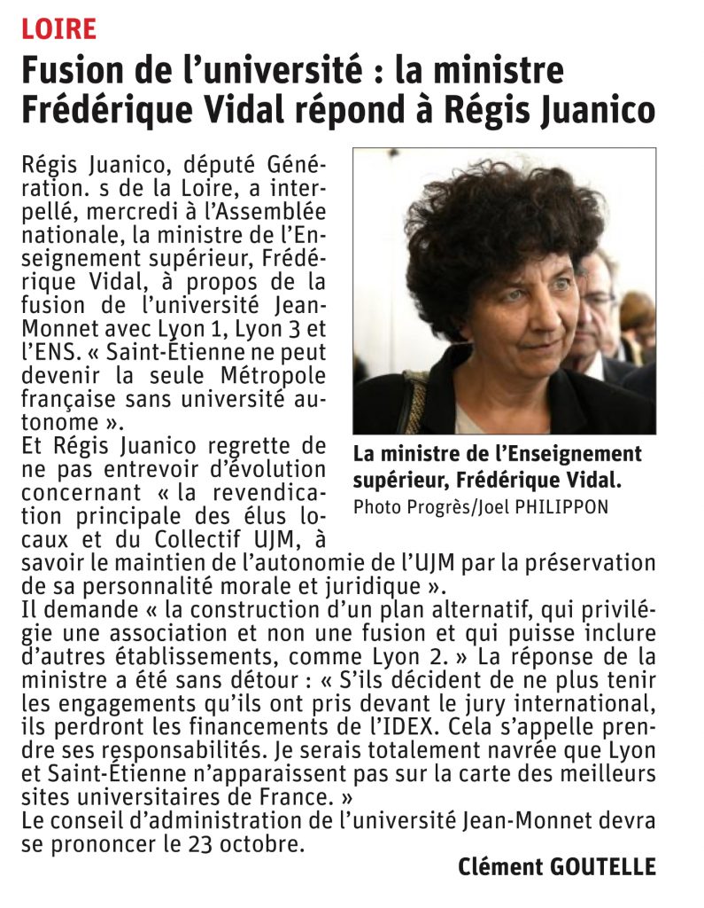 Dans sa réponse, Frédérique Vidal s’est engagée à recevoir les élus locaux inquiets des conséquences du projet de fusion tel qu’il se dessine et à « respecter les établissements ». Le passage en force n’est pas une option : notre territoire mérite mieux que cela ! Saint-Etienne ne peut devenir la seule Métropole française sans université autonome. Le projet de fusion doit être remis à plat dans le cadre d’une concertation apaisée, comme je l’ai suggéré à la Ministre en juillet. Seule une large concertation de tous les acteurs politiques et universitaires de la Loire et du Rhône nous permettra de sortir de cette impasse par le haut.