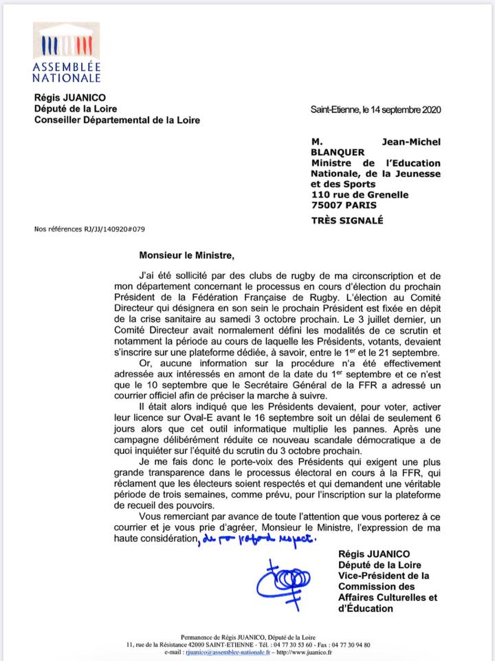 J’ai été sollicité par des clubs de rugby de ma circonscription et de mon département concernant le processus en cours d’élection du prochain Président de la Fédération Française de Rugby.