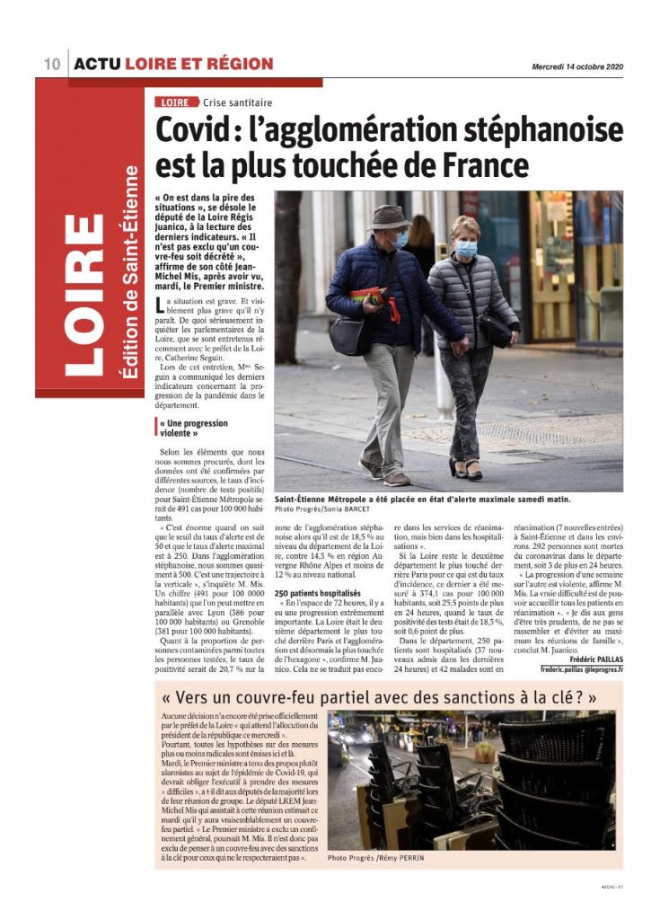 RJ : « Je décris la réalité, c’est-à-dire que nous faisons face au début d’une 2e vague épidémique de forte ampleur pour notre territoire et en fait la situation est très préoccupante, puisque nous avons eu des indicateurs qui se sont brutalement dégradés depuis quelques jours, depuis la fin de la semaine dernière et qui classe aujourd’hui l’agglomération de Saint-Etienne au premier rang national.