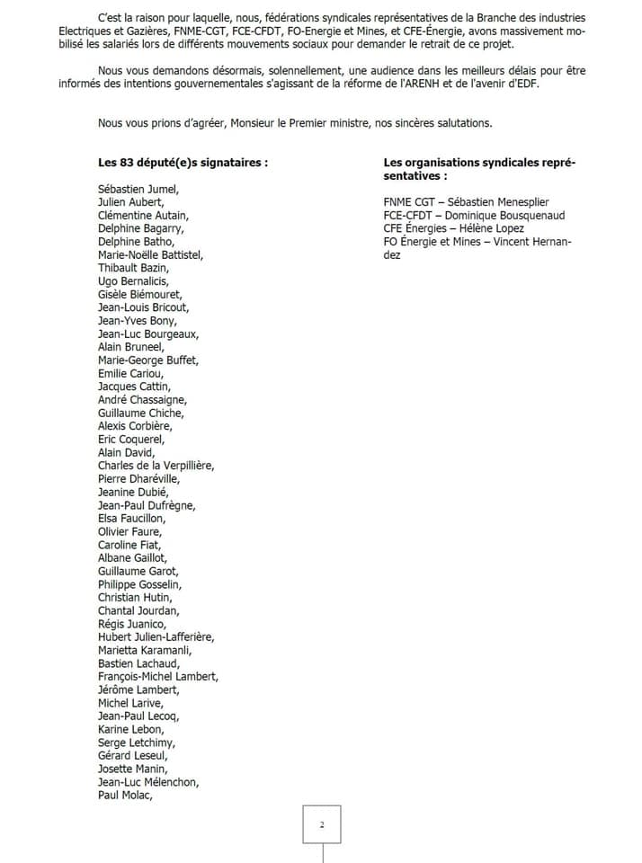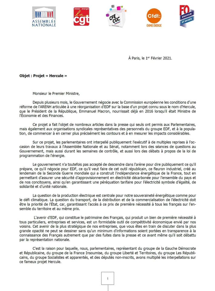 Avec 82 autres de mes collègues députés, j’ai signé cette lettre adressée au Premier ministre. La France doit rester maîtresse de sa politique énergétique. C’est un enjeu stratégique essentiel sur lequel nous ne devons pas céder.Depuis des mois nous travaillons ensemble à dénoncer le projet « Hercule » au sein de l’Assemblée Nationale. Ce projet de démantèlement d’EDF est inacceptable, un projet négocié en catimini à Bruxelles avec la Commission européenne sans aucune transparence.Après de nombreuses rencontres, dont celle du 20 janvier dernier qui a réuni l’ensemble des groupes d’oppositions et les organisations syndicales représentatives d’EDF, nous pensons qu’il est nécessaire d’interpeller le Premier Ministre sur ce mauvais projet. Nous demandons que le parlement puisse se saisir de cette question, que le dialogue social reprenne, car l’enjeu de notre indépendance énergétique, de notre avenir environnemental, ne peuvent se faire sans la démocratie.