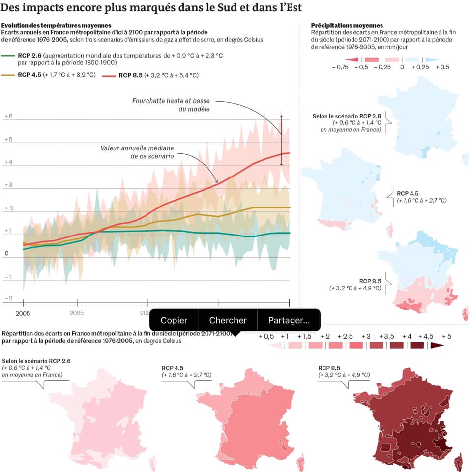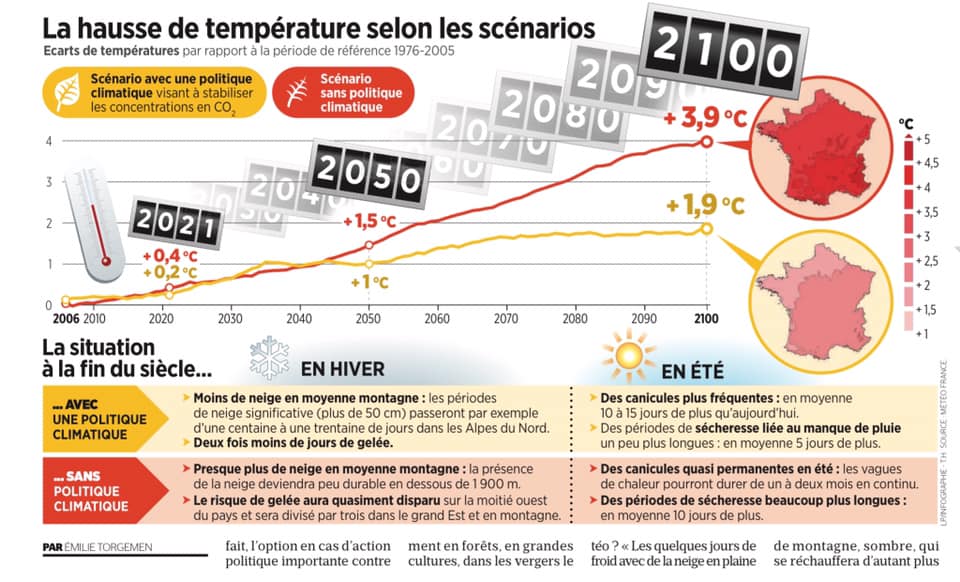 Les prévisions de Météo France, donnent un aperçu du temps qu’il fera en 2100, en fonction de la diminution – ou non – de nos émissions de gaz à effet de serre.