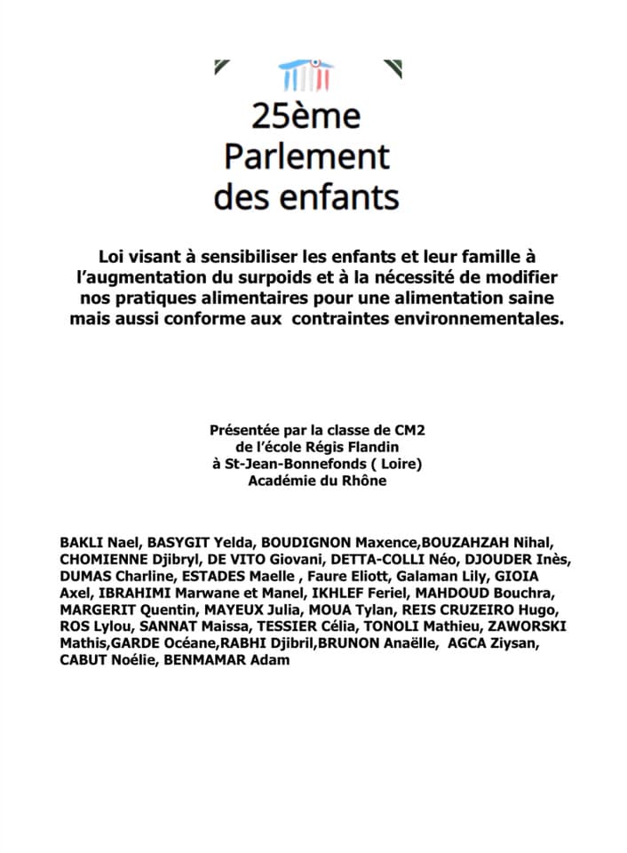Les élèves ont rédigé, sous la conduite de leurs enseignant, une proposition de loi visant à sensibiliser les enfants et leur famille à l’augmentation du surpoids et à necessité de modifier nos pratiques alimentaires pour une alimentation saine et écologique.