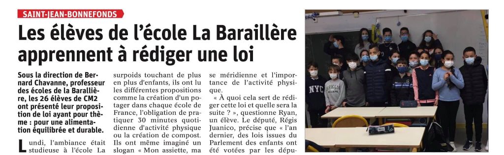 La classe de CM2 de M. Bernard Chavanne a été choisie au titre de la 1ère circonscription de la Loire pour travailler à l’élaboration d’une proposition de loi sur le thème de l’alimentation saine et équilibrée.
