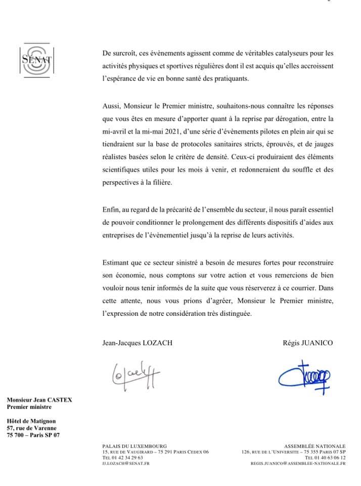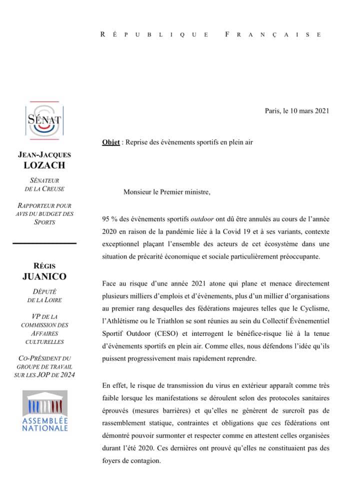 Avec mon collègue Sénateur de la Creuse, Jean-Jacques Lozach, nous avons écrit au Premier Ministre, Jean Castex, pour une reprise progressive et encadrée des événements sportifs en plein air.