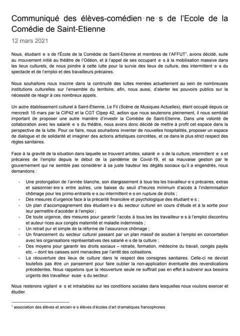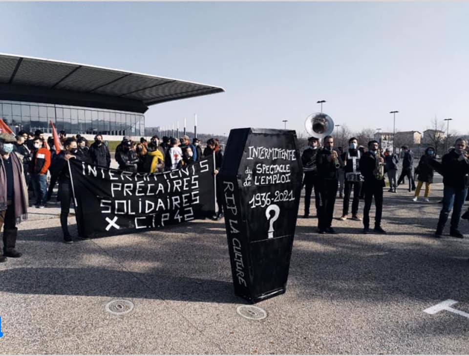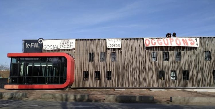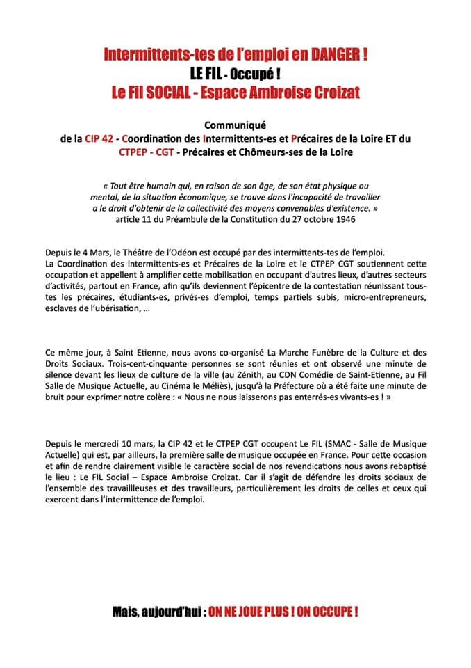Solidarité ! A l’initiative du Collectif des Intermittents et Précaires (CIP 42) et de la CGT précaires, comme d’autres lieux culturels en France (l’Odéon…), le Fil rebaptisé à cette occasion Espace social « Ambroise Croizat » est occupé depuis le mercredi 10 mars.