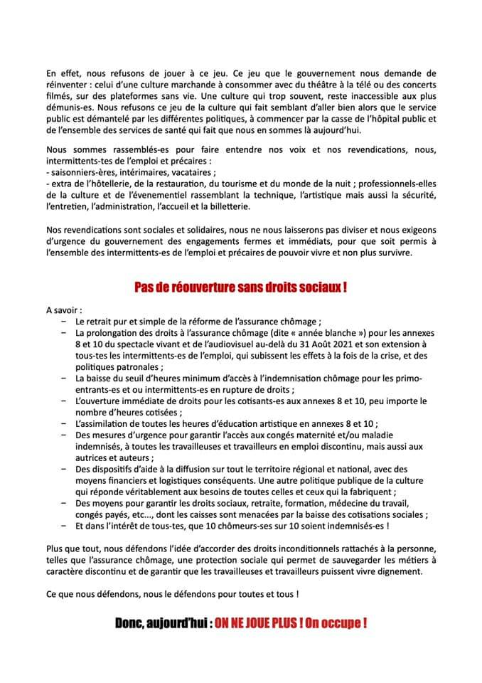 – des aides massives au secteur et leur mise en œuvre, qui ont aujourd’hui largement manqué de transparence et d’équité, en passant par un plan de relance ambitieux en concertation avec les salarié.e.s de la culture y compris les intermittents-tes
