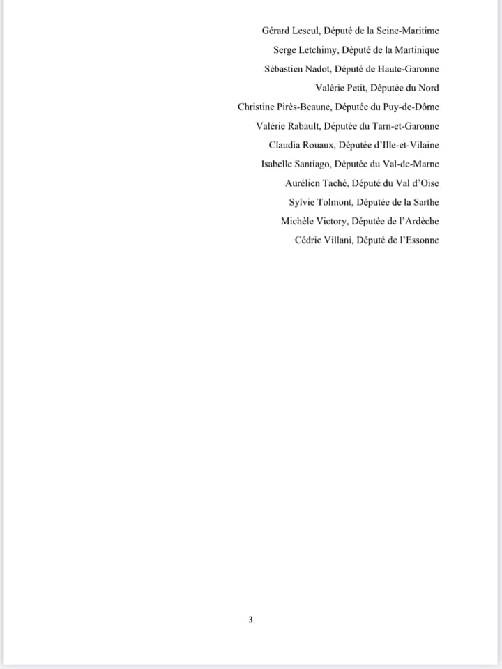Albane Gaillot, Députée du Val-de-Marne Marie-Noëlle Battistel, Députée de l’Isère Clémentine Autain, Députée de Seine-Saint-Denis Delphine Bagarry, Députée des Alpes-de-Haute-Provence Delphine Batho, Députée des Deux-Sèvres Gisèle Biemouret, Députée du Gers Jean-Louis Bricout, Député de l’Aisne Annie Chapelier, Députée du Gard Guillaume Chiche, Député des Deux-Sèvres Emilie Cariou, Députée de la Meuse Yolaine de Courson, Députée de la Côte-d’Or Alain David, Député de la Gironde Jennifer De Temmerman, Députée du Nord Jeanine Dubié, Députée des Hautes-Pyrénées Laurence Dumont, Députée du Calvados Catherine Fabre, Députée de la Gironde Caroline Fiat, Députée de Meurthe-et-Moselle Paula Forteza, Députée des Français établis hors de France Raphael Gérard, Député de Charente Maritime David Habib, Député des Pyrénées-Atlantiques Régis Juanico, Député de la Loire Hubert Julien-Laferrière, député du Rhône Marietta Karamanli, Députée de la Sarthe Bastien Lachaud, Député de la Seine-Saint-Denis, Gérard Leseul, Député de la Seine-Maritime Serge Letchimy, Député de la Martinique Sébastien Nadot, Député de Haute-Garonne Valérie Petit, Députée du Nord Christine Pirès-Beaune, Députée du Puy-de-Dôme Valérie Rabault, Députée du Tarn-et-Garonne Claudia Rouaux, Députée d’Ille-et-Vilaine Isabelle Santiago, Députée du Val-de-Marne Aurélien Taché, Député du Val d’Oise Sylvie Tolmont, Députée de la Sarthe Michèle Victory, Députée de l’Ardèche Cédric Villani, Député de l’Essonne