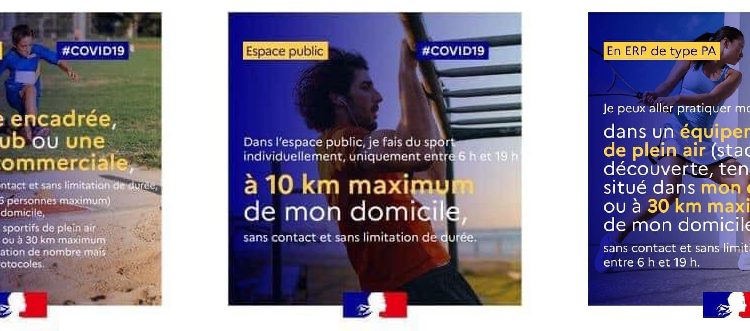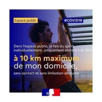 La pratique sportive individuelle dans l’espace public (dont plages, lacs, rivières, parcs, forets, montagnes…) est autorisée dans un rayon maximum de 10 km autour du domicile dans la limite de groupes de six personnes.