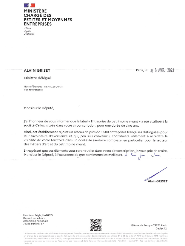 Alain Griset, Ministre délégué auprès du Ministre de l’Économie, des Finances et de la Relance, chargé des Petites et Moyennes Entreprises, vient de m’informer que la société Cellux, implantée à Saint-Genest-Lerpt, vient d’être  labellisée « entreprise du patrimoine vivant » (*), pour une durée de 5 ans.