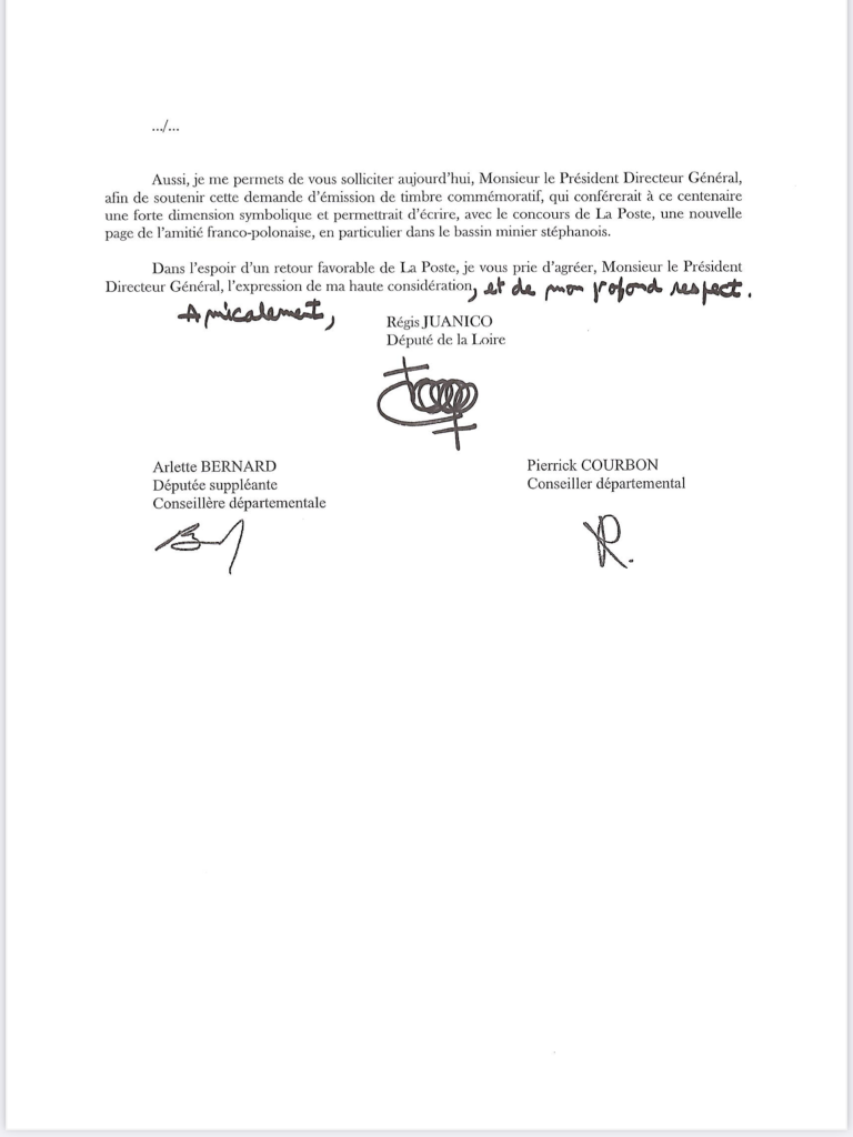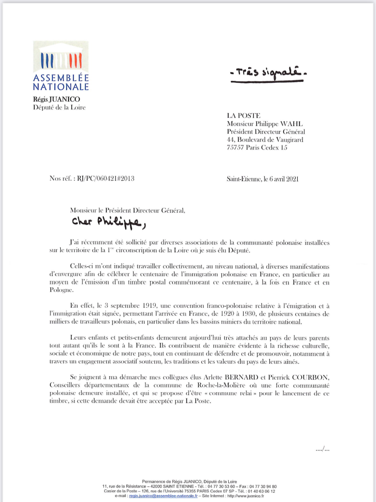 Récemment sollicités par diverses associations de la communauté polonaise installées sur notre territoire, et particulièrement à Roche-la-Molière, avec mes collègues Arlette Bernard, Députée suppléante et conseillère départementale, et Pierrick Courbon, conseiller départemental, nous venons d’interpeller le Président Directeur Général de La Poste, afin de soutenir l’émission d’un timbre postal officiel commémorant le centenaire de l’immigration polonaise en France. »