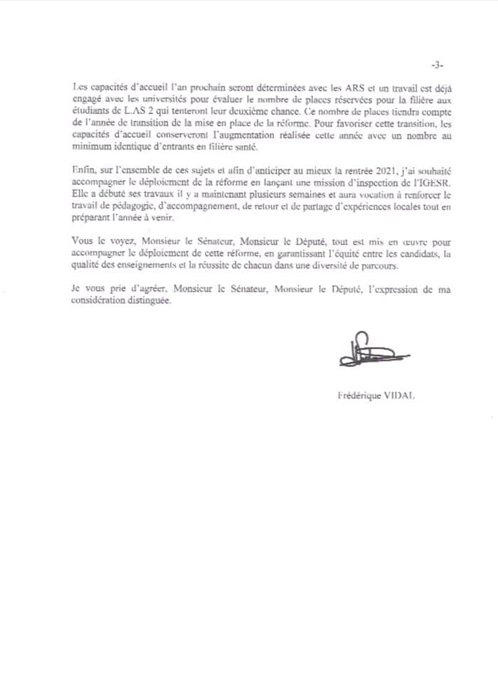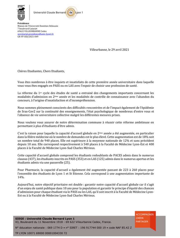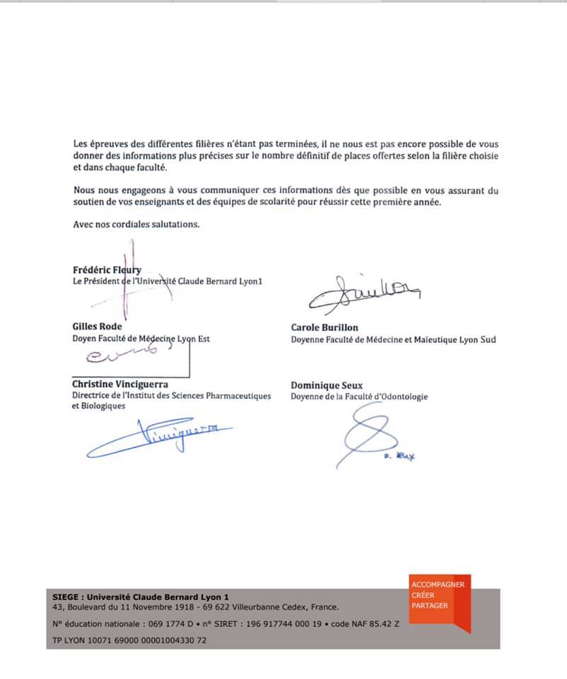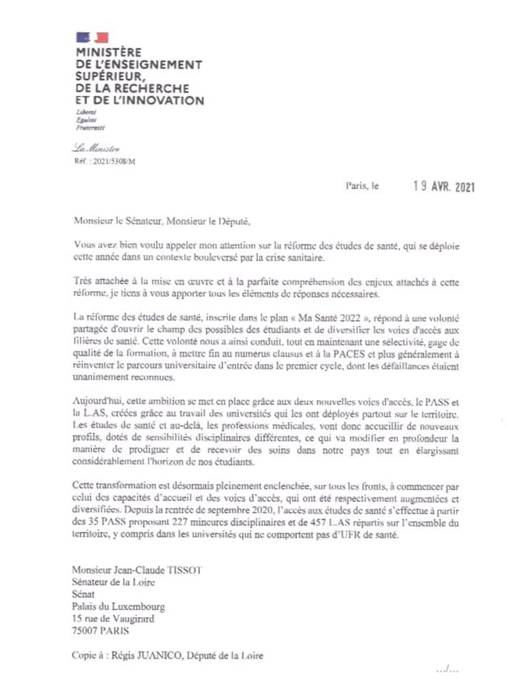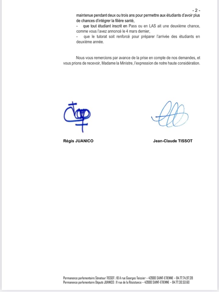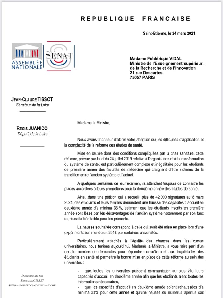 Après une première réponse insipide et décevante de la Ministre de l’Enseignement supérieur et de la recherche, Frédérique Vidal à notre interpellation sur les conséquences injustes de la réorganisation des études santé pour les étudiants de première année (Pass/L.as) et de 2e année (PACES), nous avons décidé avec le sénateur Jean-Claude Tissot d’écrire au président de l’Université Claude Bernard de Lyon 1, Frédéric Fleury et aux doyens des facultés de médecine de Lyon.