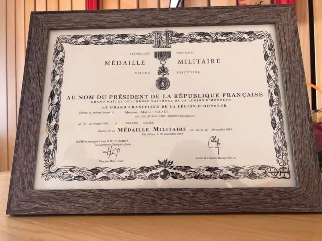 Nous avions écrit avec Pierrick Courbon et Arlette Bernard à la mInistre de la Défense Nationale Florence Parly en juin 2018 pour proposer l’attribution de la médaille militaire à Marcel Gazet pour ses faits d’armes, ce qu’elle avait accepté par décret au titre de la promotion du 30 octobre 2019.