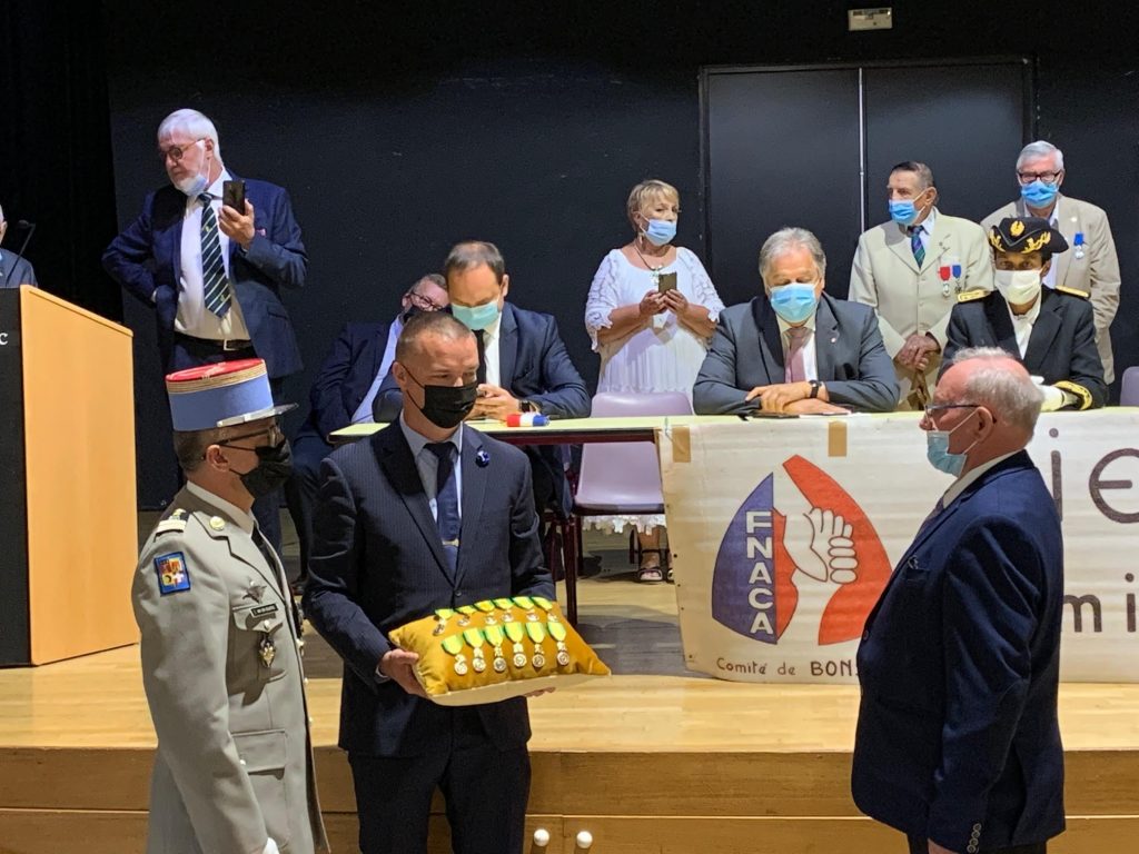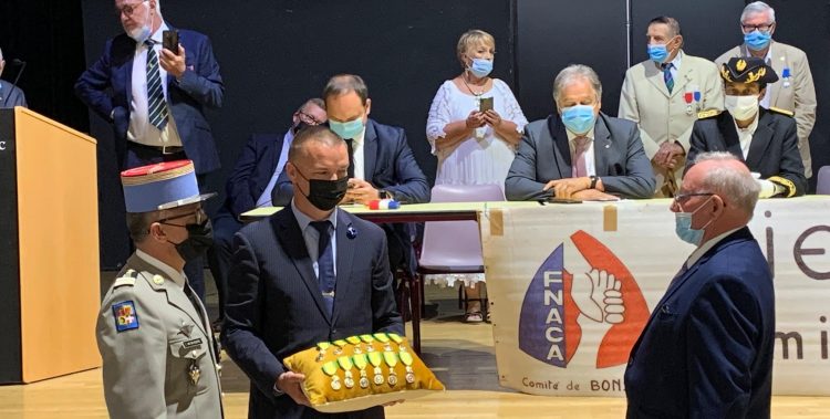 Longuement reportée en raison de la situation épidémique, une importante cérémonie de remise de médailles militaires et de diplômes de porte-drapeau à d’Anciens combattants membres de la FNACA a enfin pu se tenir cette semaine à Bonson, en présence de nombreux élus, de la Sous-Préfète et des autorités militaires départementales.