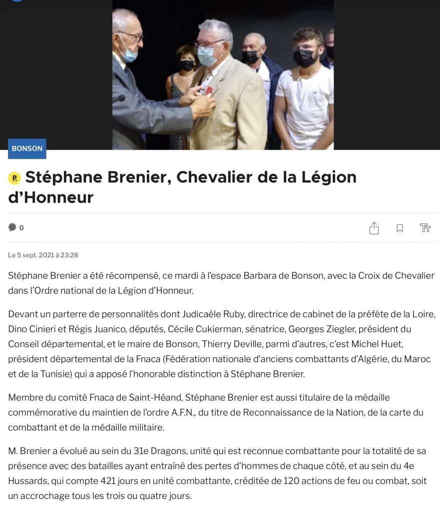Par ailleurs, cette cérémonie aura été l’occasion de remettre 7 diplômes de porte-drapeau par le Directeur de l’ONAC 42, plusieurs diplômes d’honneur de la FNACA, pour service éminent rendu par les récipiendaires au sein de leur comités respectifs, et surtout, une croix de Chevalier dans l’ordre national de la Légion d’Honneur à Stéphane BRENIER, du comité FNACA de Saint-Héand, membre du 31ème Dragons et du 4ème Hussards, unités au sein desquelles il aura effectué plus de 120 actions de feu.