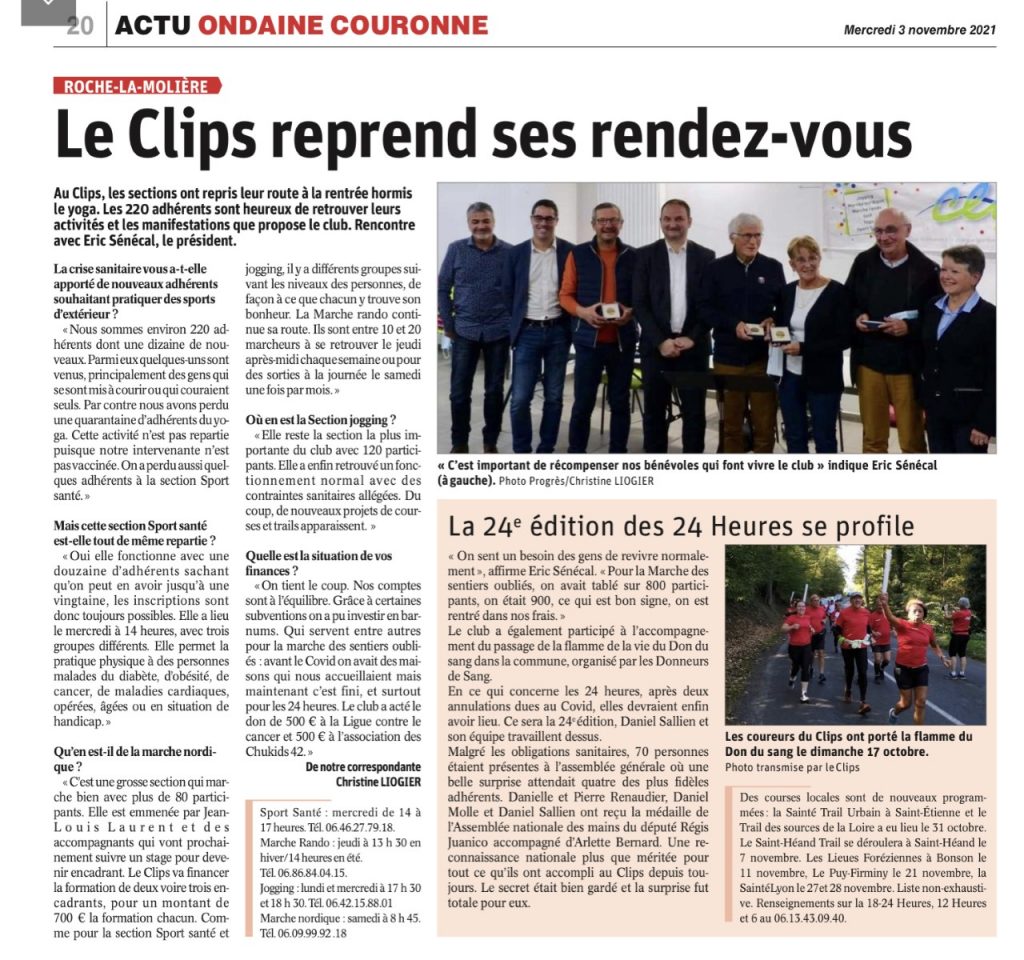 Vendredi 22 octobre se tenait l’Assemblée générale du CLIPS, Club d’Initiation à la Pratique Sportive, devant une assistance nombreuse, comme à l’accoutumée. Après la présentation des différents rapports, moral, d’activité et financier par le Président Eric Sénécal et son équipe, et l’esquisse prudente de perspectives pour l’année à venir, j’ai souhaité, avec Arlette Bernard, Conseillère départementale et Députée suppléante, mettre à l’honneur 4 figures emblématiques du club, des bénévoles responsables dont l’engagement au sein du CLIPS force le respect de tous : Danielle et Pierre Renaudier, ainsi que Daniel Molle et Daniel Sallien.