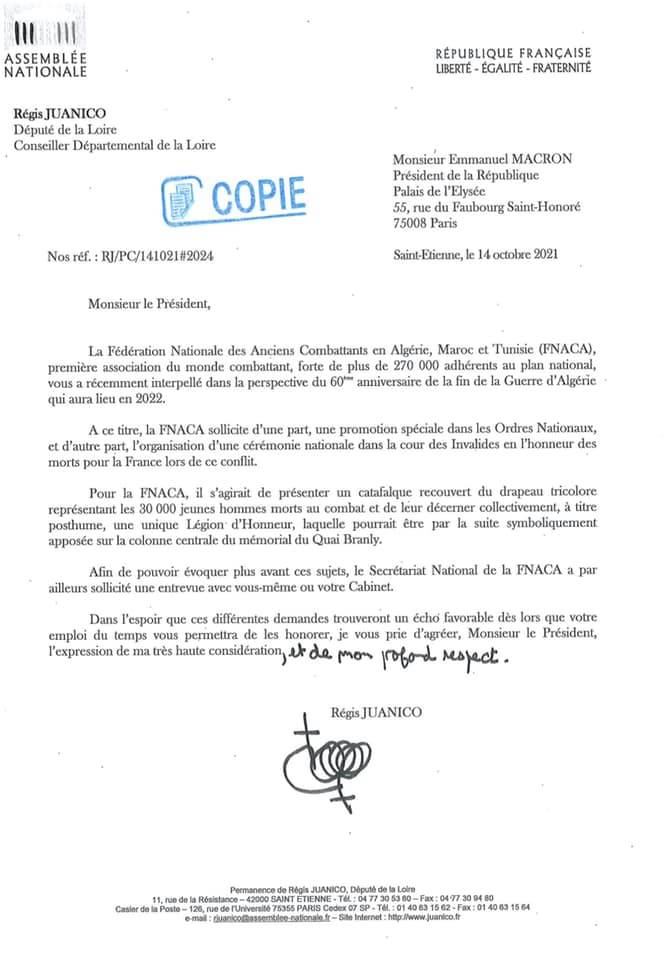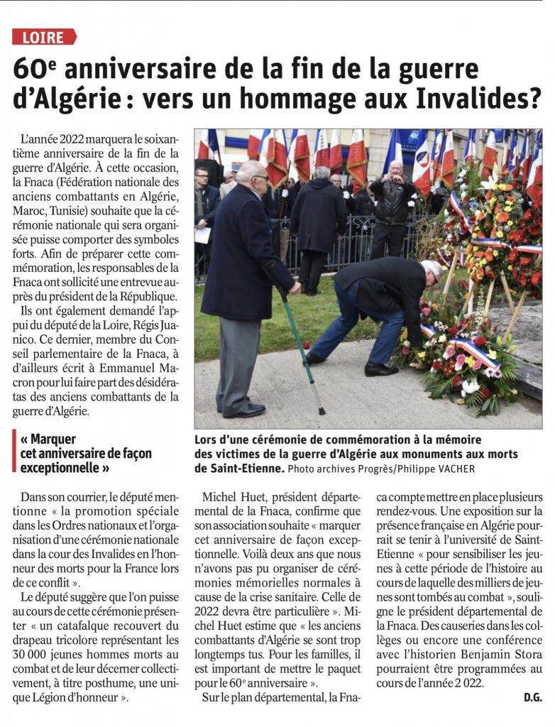 La Fédération Nationale des Anciens Combattants en Algérie, Maroc et Tunisie (FNACA), première association du monde combattant, forte de plus de 270 000 adhérents au plan national, vous a récemment interpellé dans la perspective du 60ème anniversaire de la fin de la Guerre d’Algérie qui aura lieu en 2022.