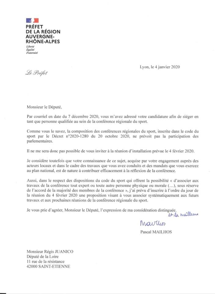 Nommé membre de la Conférence régionale du sport par le Préfet de la Région Auvergne-Rhone-Alpes, Pascal Mailhos