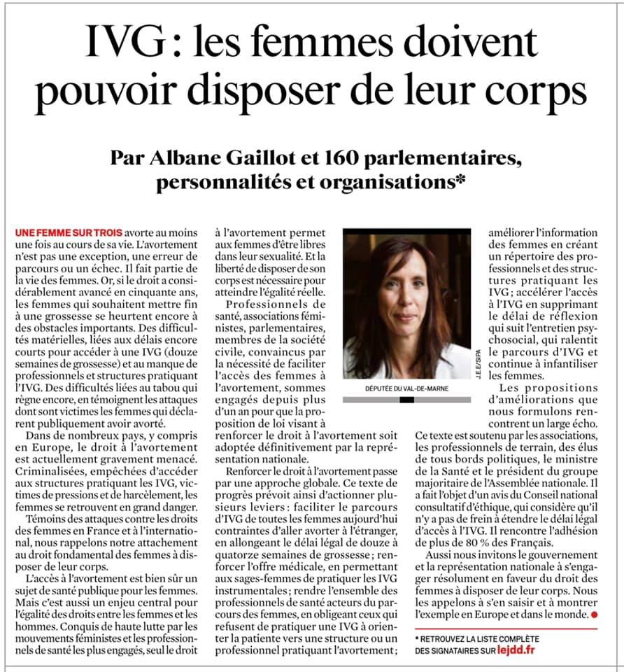 Aussi nous invitons le Gouvernement et la représentation nationale à s’engager résolument en faveur du droit des femmes à disposer de leurs corps. Nous les appelons à s’en saisir et à montrer l’exemple en Europe et dans le monde.