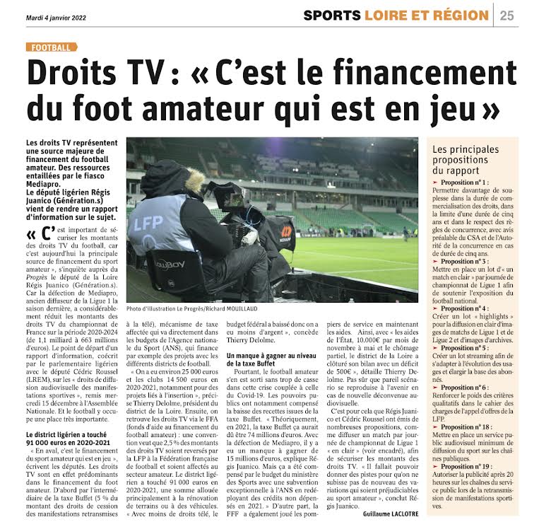 Retrouvez l’article du Progrès de ce mardi 4 janvier qui revient sur notre rapport de la mission d’information parlementaire sur les droits audiovisuels du sport avec Cédric Roussel.