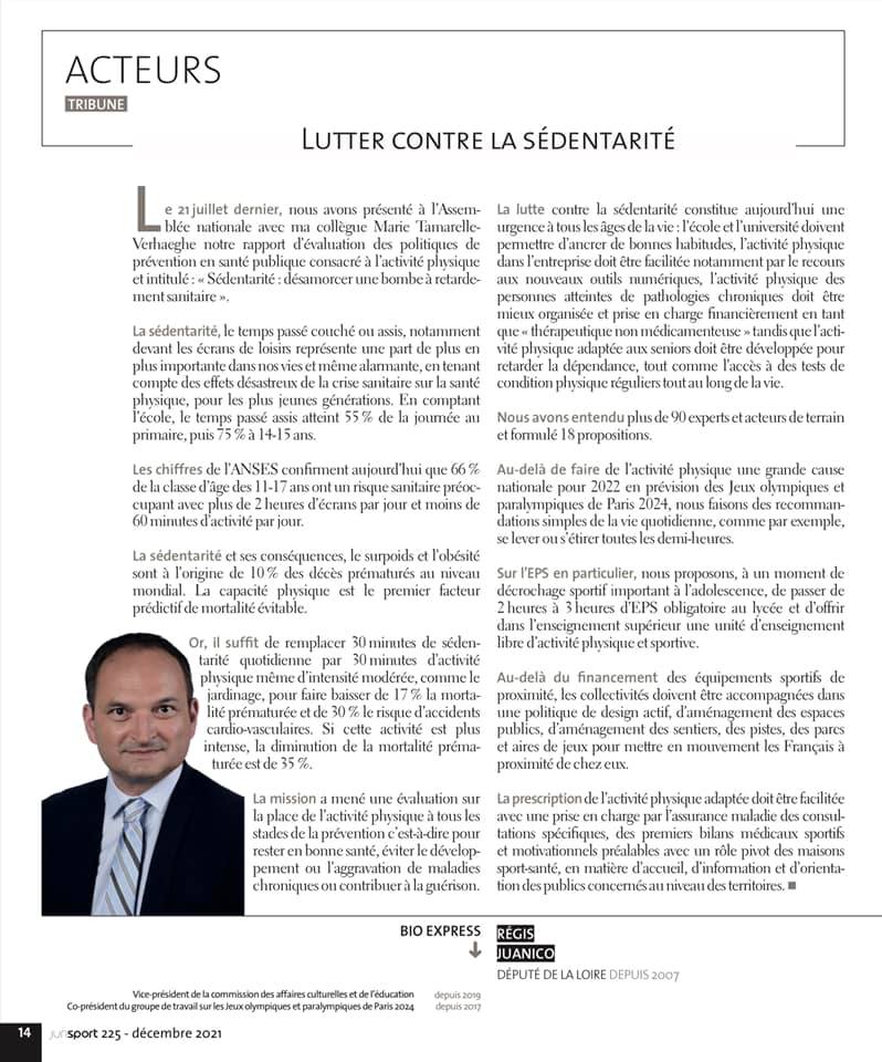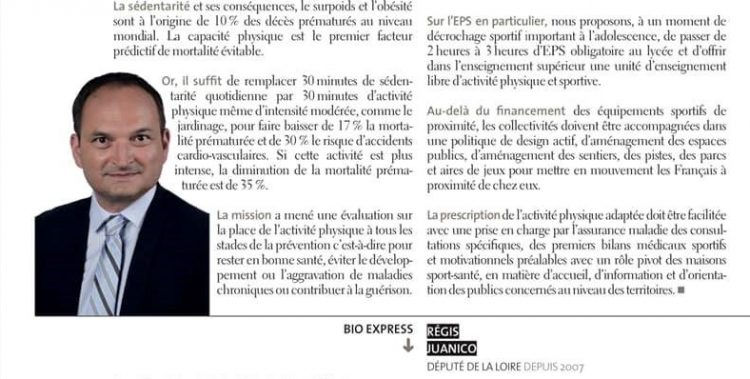 « Le 21 juillet dernier, nous avons présenté à l’Assemblée Nationale avec ma collègue Marie Tamarelle-Verhaeghe notre rapport d’évaluation des politiques de prévention en santé publique consacré à l’activité physique et intitulé : « Sédentarité : désamorcer une bombe à retardement sanitaire ».