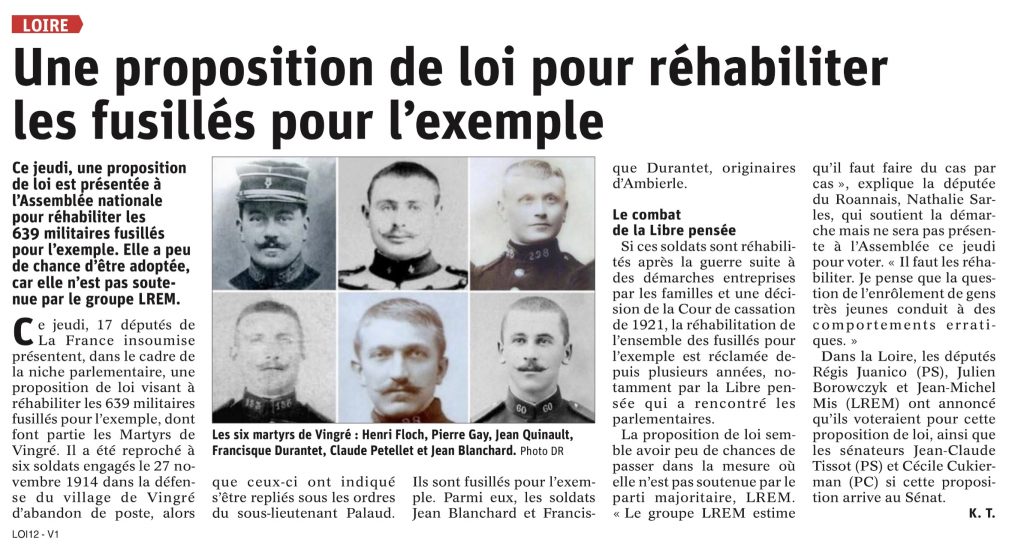 Parmi eux, les « Martyrs de Vingré ». Il a été reproché à ces six soldats engagés le 27 novembre 1914 dans la défense du village de Vingré d’abandon de poste, alors que ceux-ci ont indiqué s’être repliés sous les ordres du sous-lieutenant Palaud. Ils sont fusillés pour l’exemple dont les soldats Jean Blanchard et Francisque Durantet, originaires d’Ambierle.