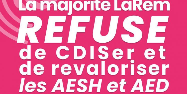 Ainsi, les députés de la majorité ont réécrit le texte en laissant la possibilité au pouvoir règlementaire d’accorder un CDI après 3 ans pour les AESH, 6 ans pour les AED, ce qui est très décevant et en deçà de la proposition initial et des renvendications des concernés.