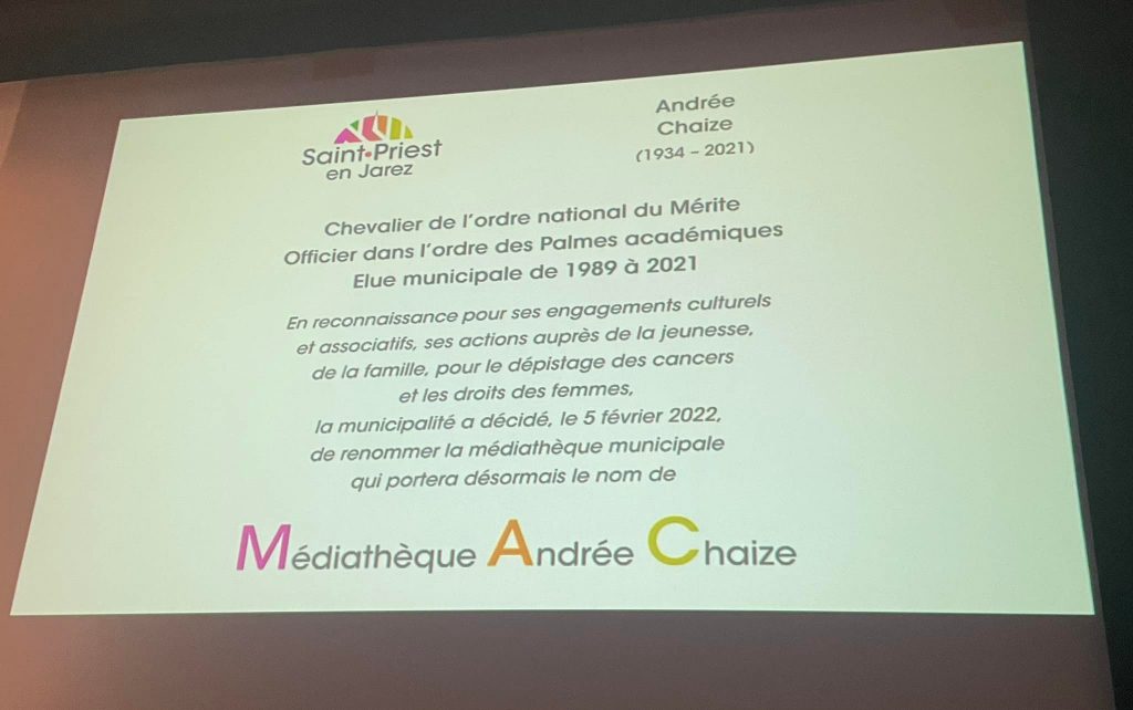 Je veux remercier les élus Mounards d’avoir décidé en conseil municipal de donner le nom d’Andrée Chaize, à la médiathèque communale.