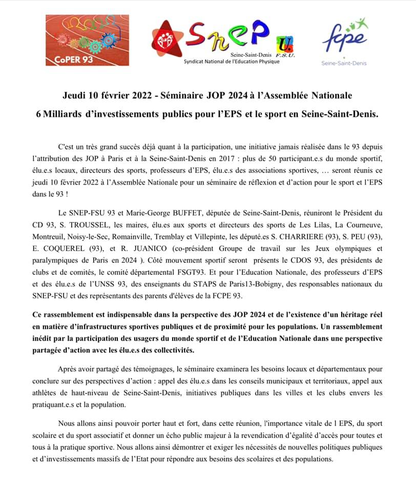 En tant que co-président Groupe de travail sur les Jeux olympiques et paralympiques de PARIS 2024, j’étais présent le 10 février, à l’Assemblée Nationale pour la réunion du Collectif permanent de défense de l’EPS, du sport scolaire et du sport associatif en Seine-Saint-Denis à l’initiative du SNEP-FSU 93 et de ma collègue députée dyonisienne, ancienne ministre des sports, Marie-George Buffet.