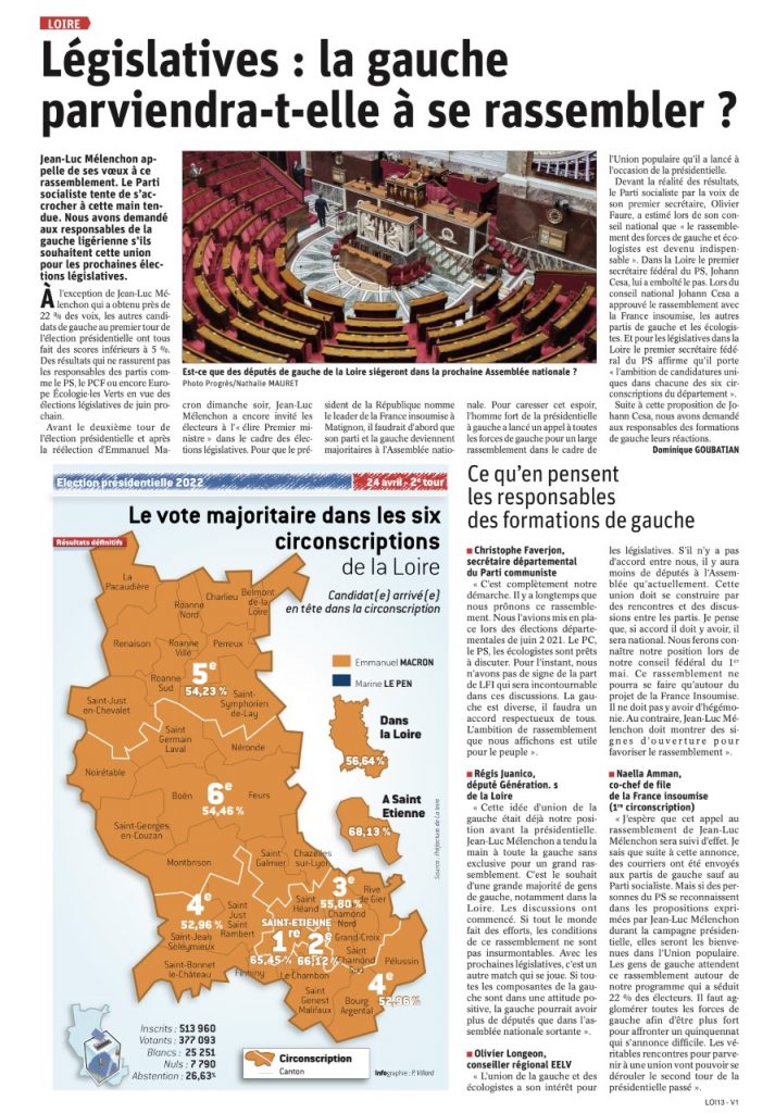 J’appelle toutes les forces de gauche et les écologistes dans leur diversité à s’unir dès maintenant dans l’ensemble du pays sous la bannière de l’Union Populaire comme l’a proposé Jean-Luc Mélenchon mardi dernier afin de défendre dans toutes les circonscriptions des candidatures communes et d’élire un maximum de députés les 12 et 19 juin prochains.