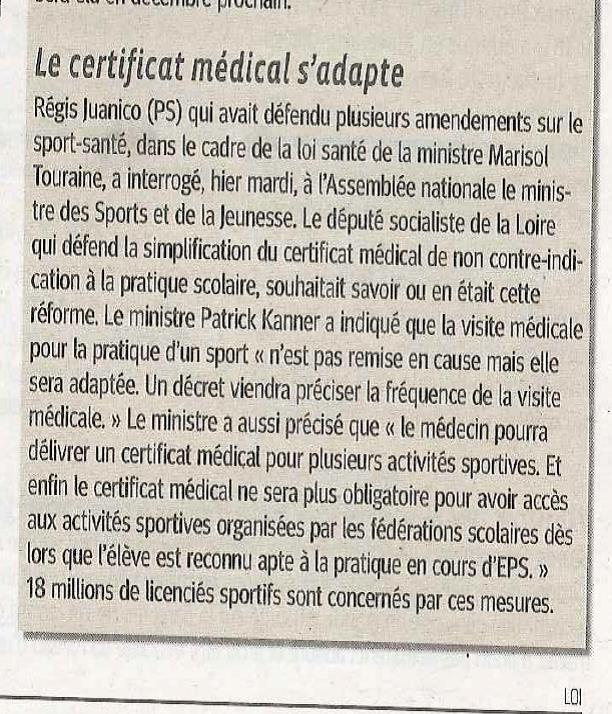 Le texte de loi contient une autre avancée : la simplification du certificat médical de non contre-indication à la pratique sportive.