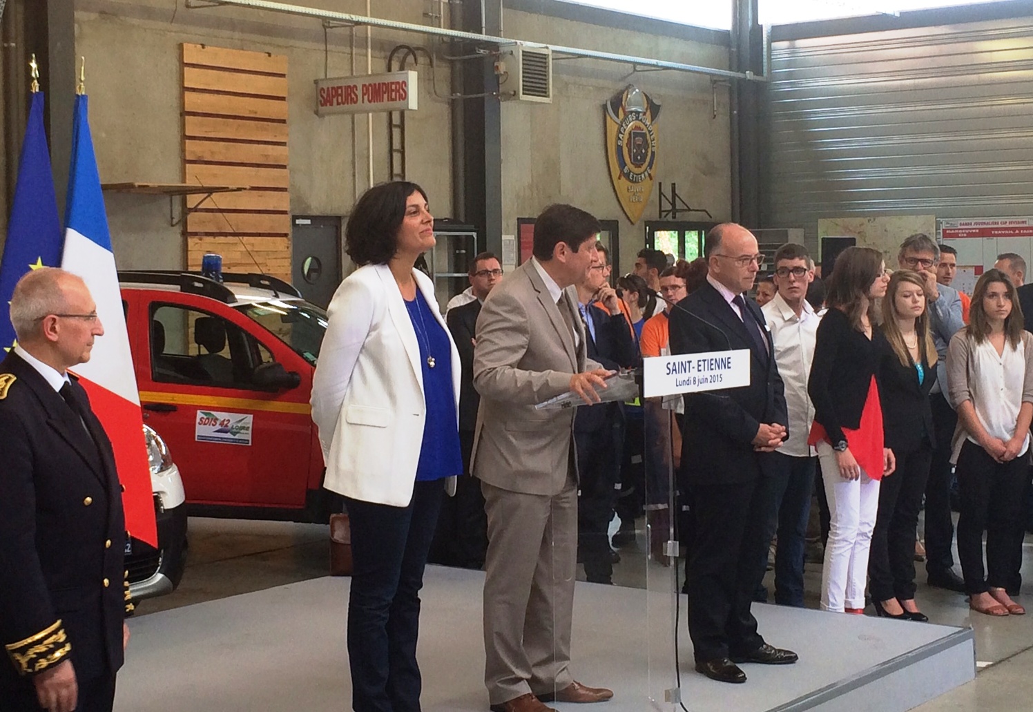 Les Ministres Patrick Kanner (Ville, Jeunesse et Sport), Bernard Cazeneuve (Intérieur), et la Secrétaire d’Etat à la Politique de la Ville Myriam El Khomri, à la caserne Séverine, pour la signature de l’engagement dans le service civique de six jeunes, le 8 juin 2015.
