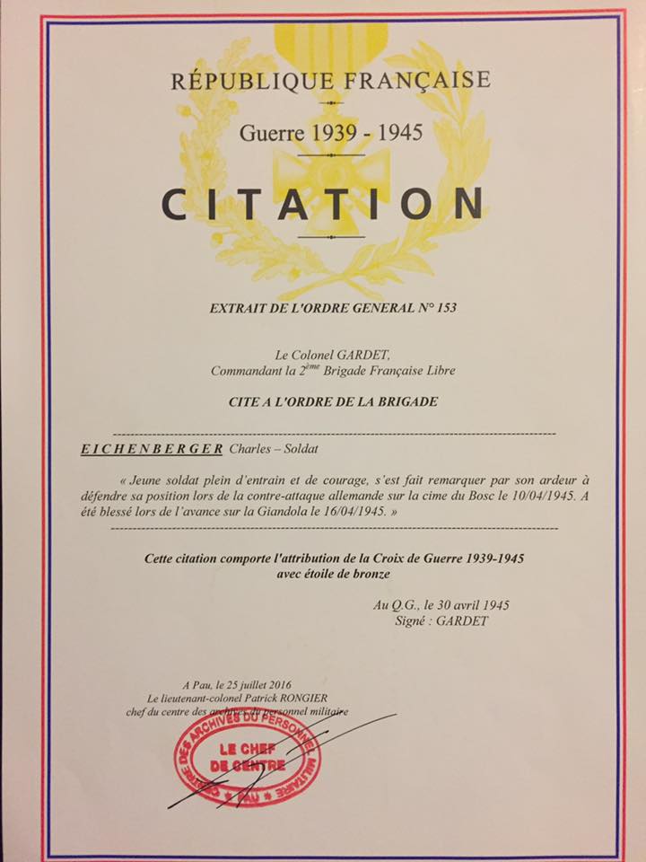 Cité à l’ordre de la Brigade le 30 avril 1945, avec attribution de La Croix de Guerre, étoile de Bronze, cette distinction ne lui avait jamais été officiellement remise. 70 ans après ses actes de bravoure qui l’ont vu échapper par miracle à la mort – un de ses camarades ayant sauté sur une mine sous ses yeux, lui étant gravement blessé – c’est chose faite depuis hier.